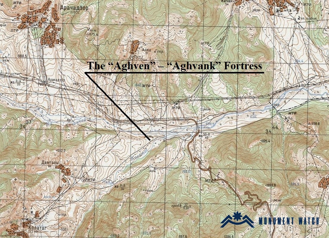 Эту крепость епископ М. Бархударян называет «Агуанк», к сожалению, без ссылки на какой - либо письменный источник и без пояснения. Так, говоря о крепости Качагакаберд, исследователь отмечает, что у его подножья находится крепость Агуанк: « Несмотря на многие наши усилия, нам не удалось выяснить, почему эта старинная крепостная стена, лежащая между рекой Хачен и его притоком Колатак, недалеко от их слияния, называется Агуанк… эта стена сооружена таким образом, чтобы не позволить врагу проникнуть в ущелье» ( Бархутарянц 1985, 198). Можно предположить, что так называемая «стена Агуан», то есть крепость так была названа местными армянами.